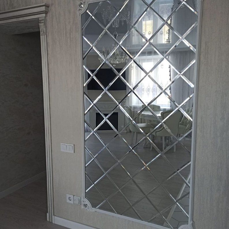 Использована серебристая квадратная зеркальная плитка размером 18х18.